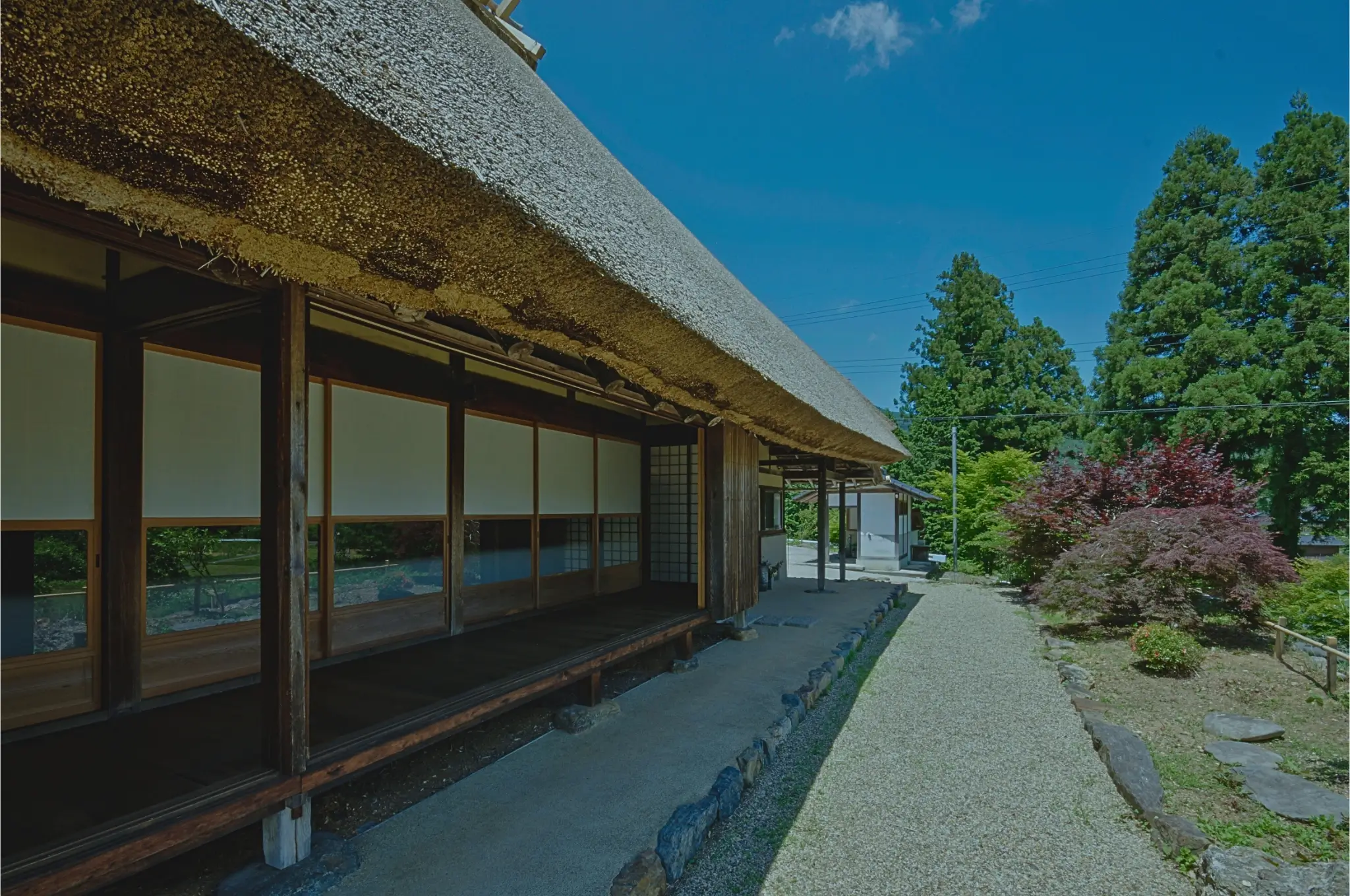 Mitoya’s roof is built in a traditional style known as “fukioroshi,” where the thatch is laid all the way down to the edge of the eaves. This style, passed down through generations, creates a powerful silhouette and protects the house naturally with its deep overhang and soft shadows.