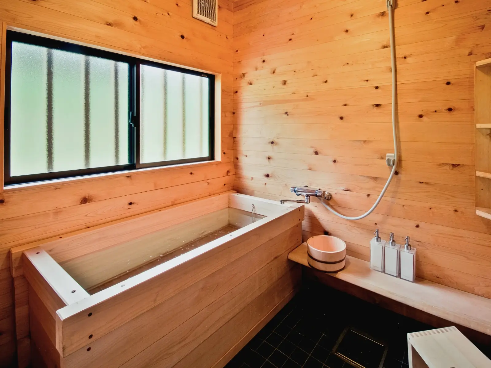 1 bathroom with a Hinoki bathtub (Japanese cypress)and one shower