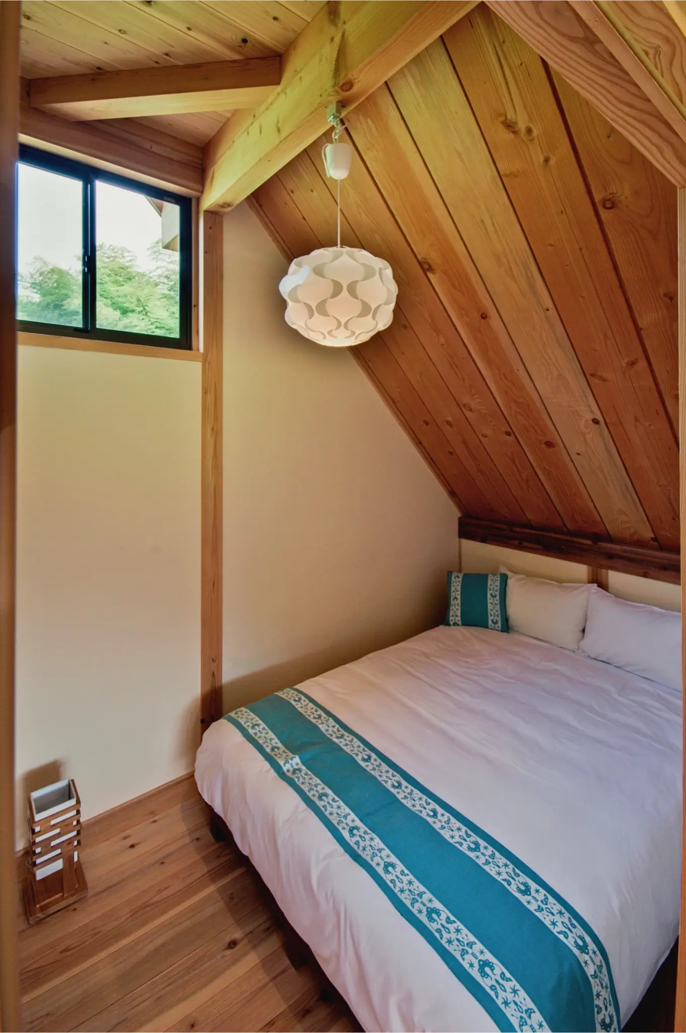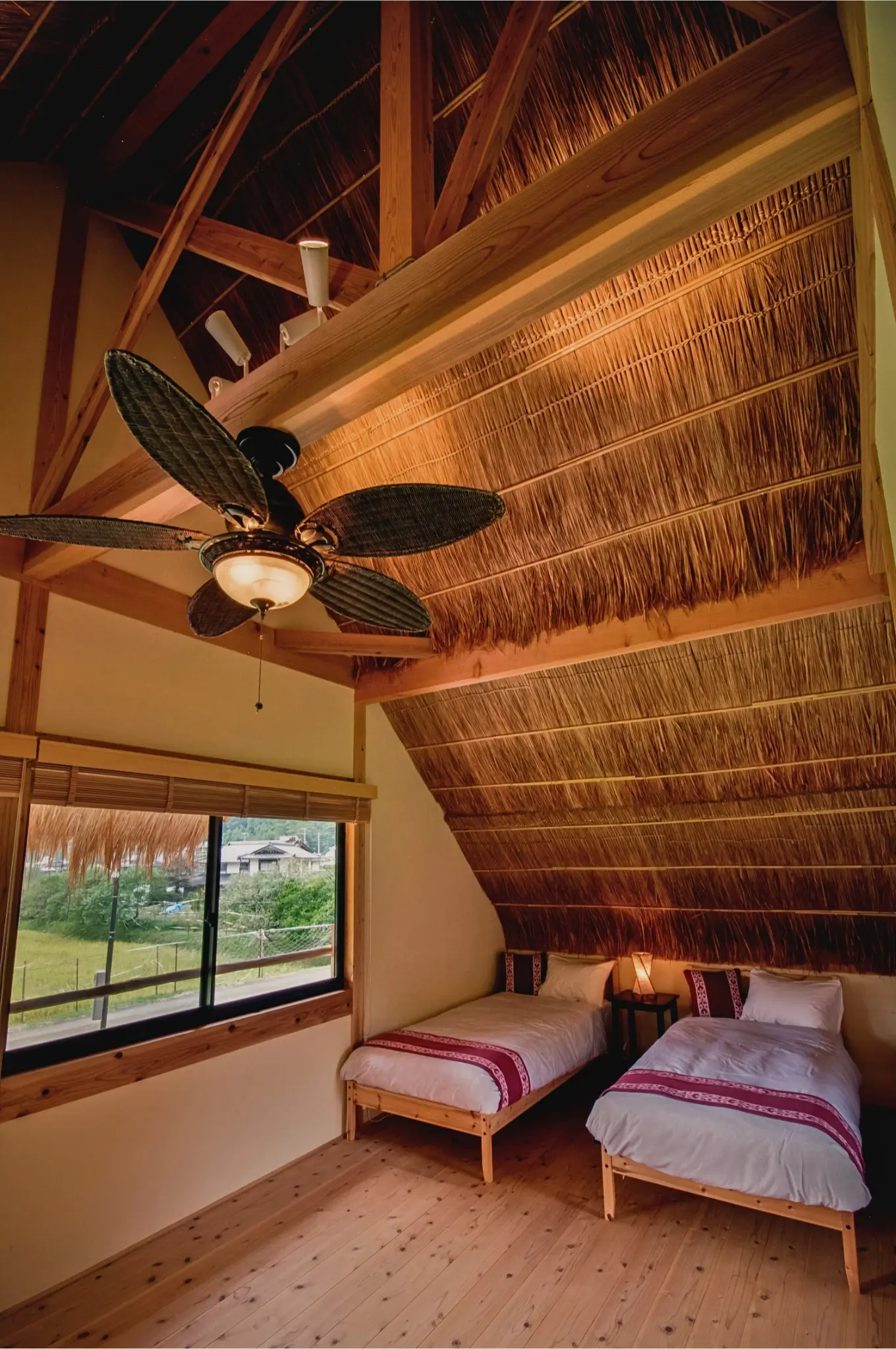 On the second floor, you can experience the beauty of the thatched roof structure up close. From the bedroom with a double bed and a single bed, you can enjoy breathtaking sunset views through the windows, turning every evening into a memorable moment.
